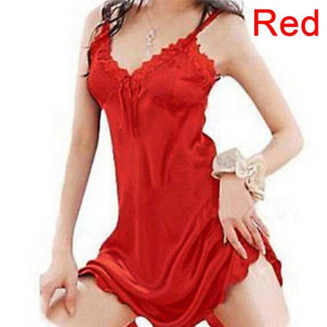 ผู้หญิงชุดนอนเซ็กซี่ Nightgown ผ้าไหมซาติน Babydoll Lace ชุดคลุมนอนกระโปรงชุดเดรสสีแดง